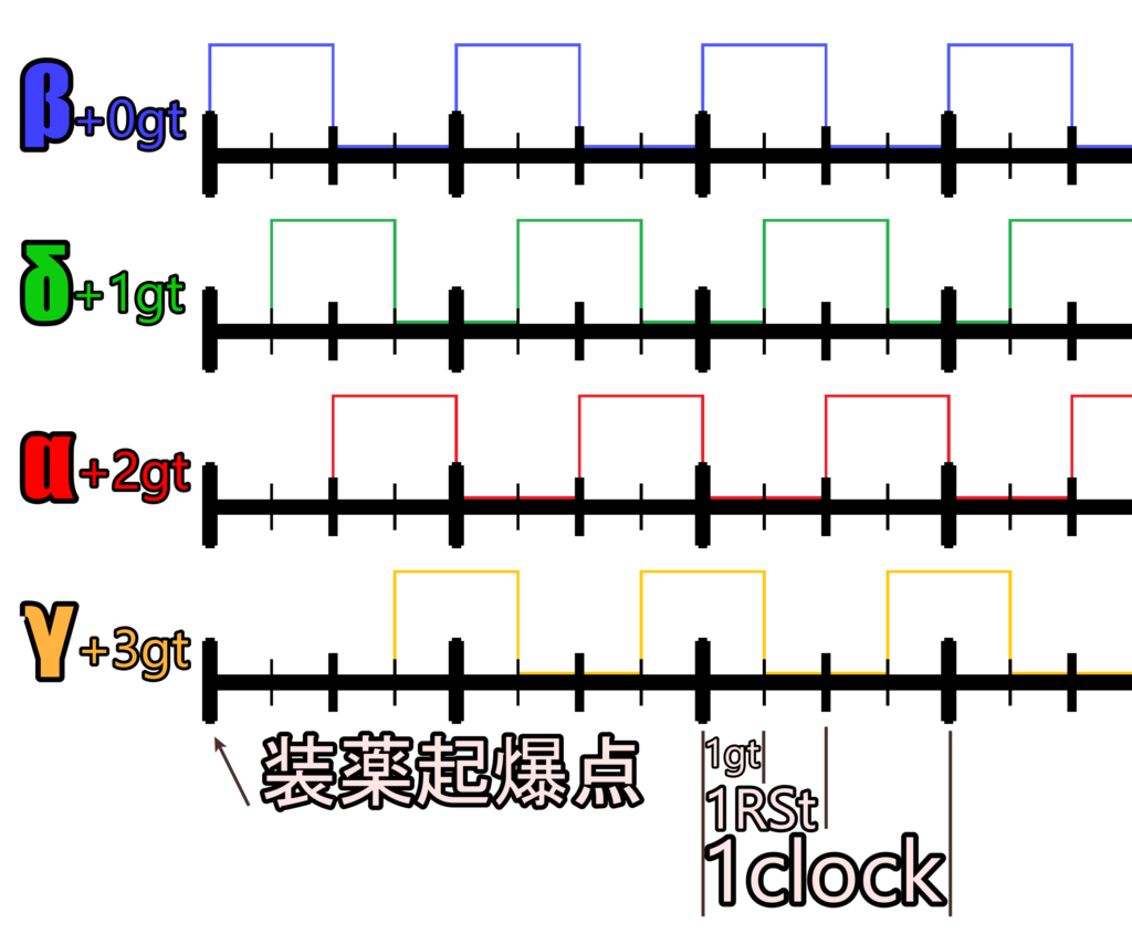 α, β, γ, δ 信管とは装薬起爆タイミングからのクロックのずれを表すものでそれぞれ